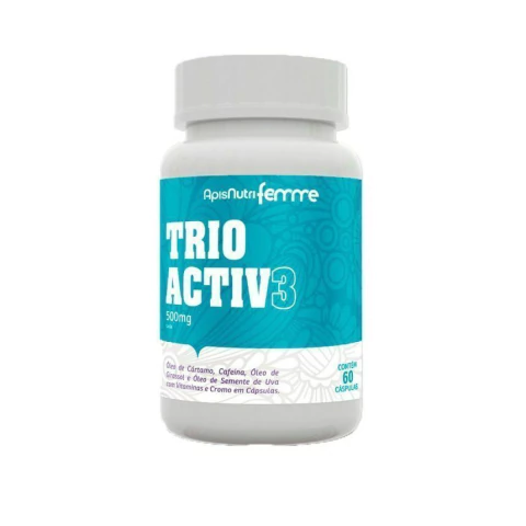 TRIO ACTIV3 500mg (60 caps) - APISNUTRI Com ativos que complementam a alimentação, o Trio Activ3 da Apisnutri, possui Óleos de Cártamo, Girassol e Semente de Uva em sua composição, além de cafeína, Vitaminas B5, E e A, Picolinato de Cromo e Lecitina de Soja. Seu consumo auxilia no emagrecimento e queima de gordura, além de gerar energia e disposição para o dia a dia. BENEFÍCIOS * Diminuição da gordura localizada; * Sensação de saciedade e diminuição do apetite; * Aumento da imunidade; * Ação antioxidante; * Ajuda o sistema cardiovascular; * Diminui o colesterol ruim. Embalagem disponível: frasco contendo 60 cápsulas.